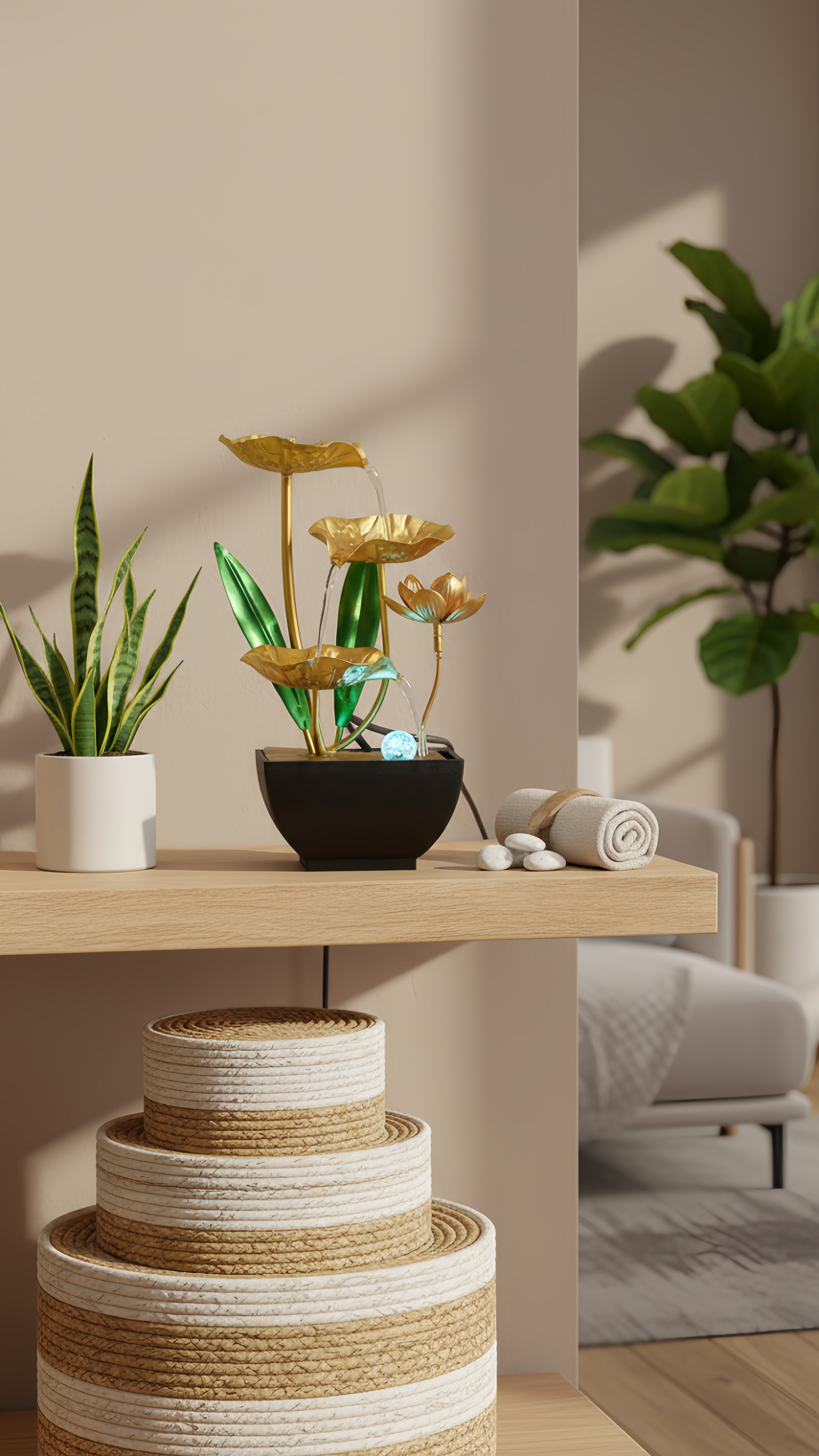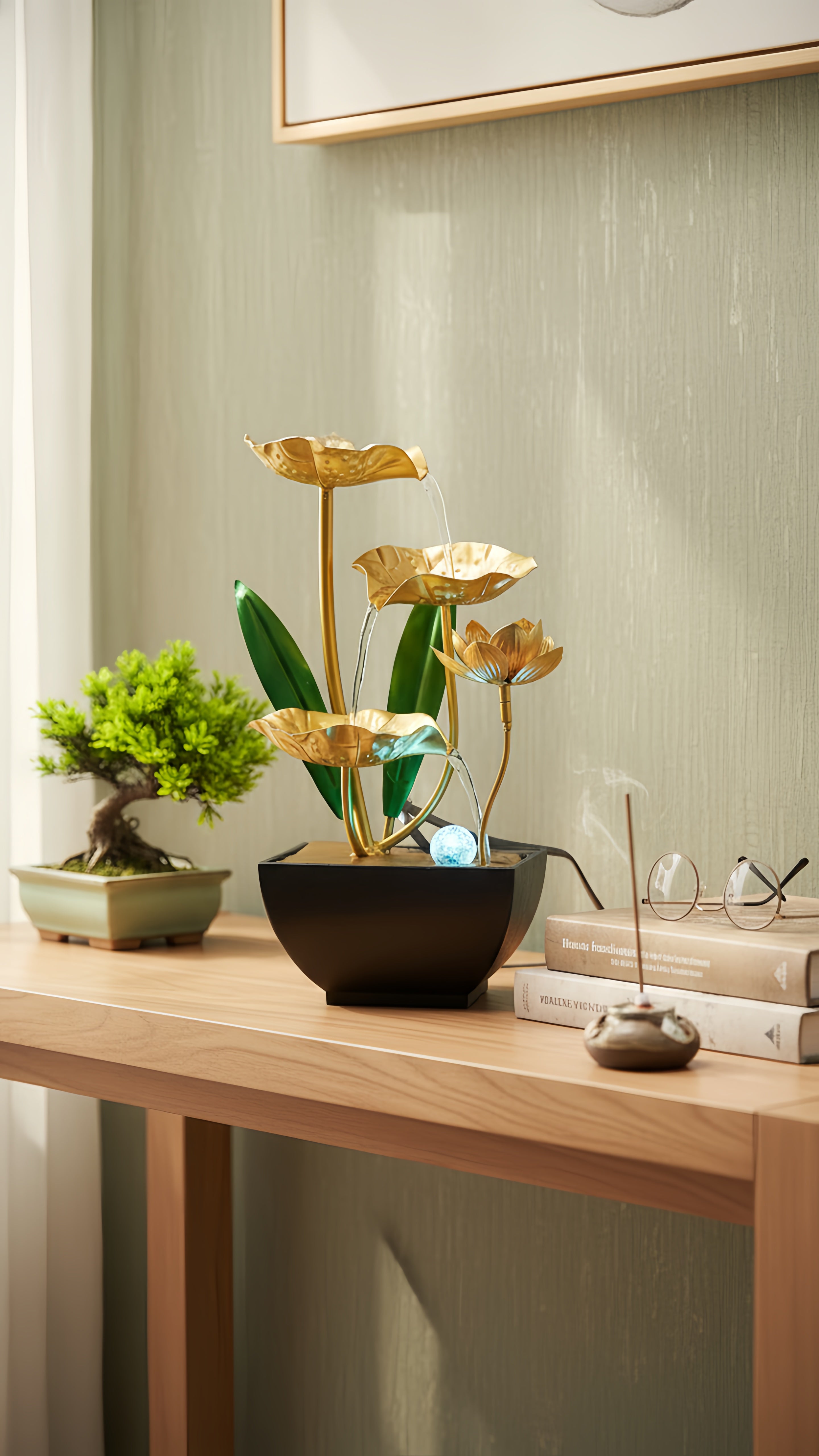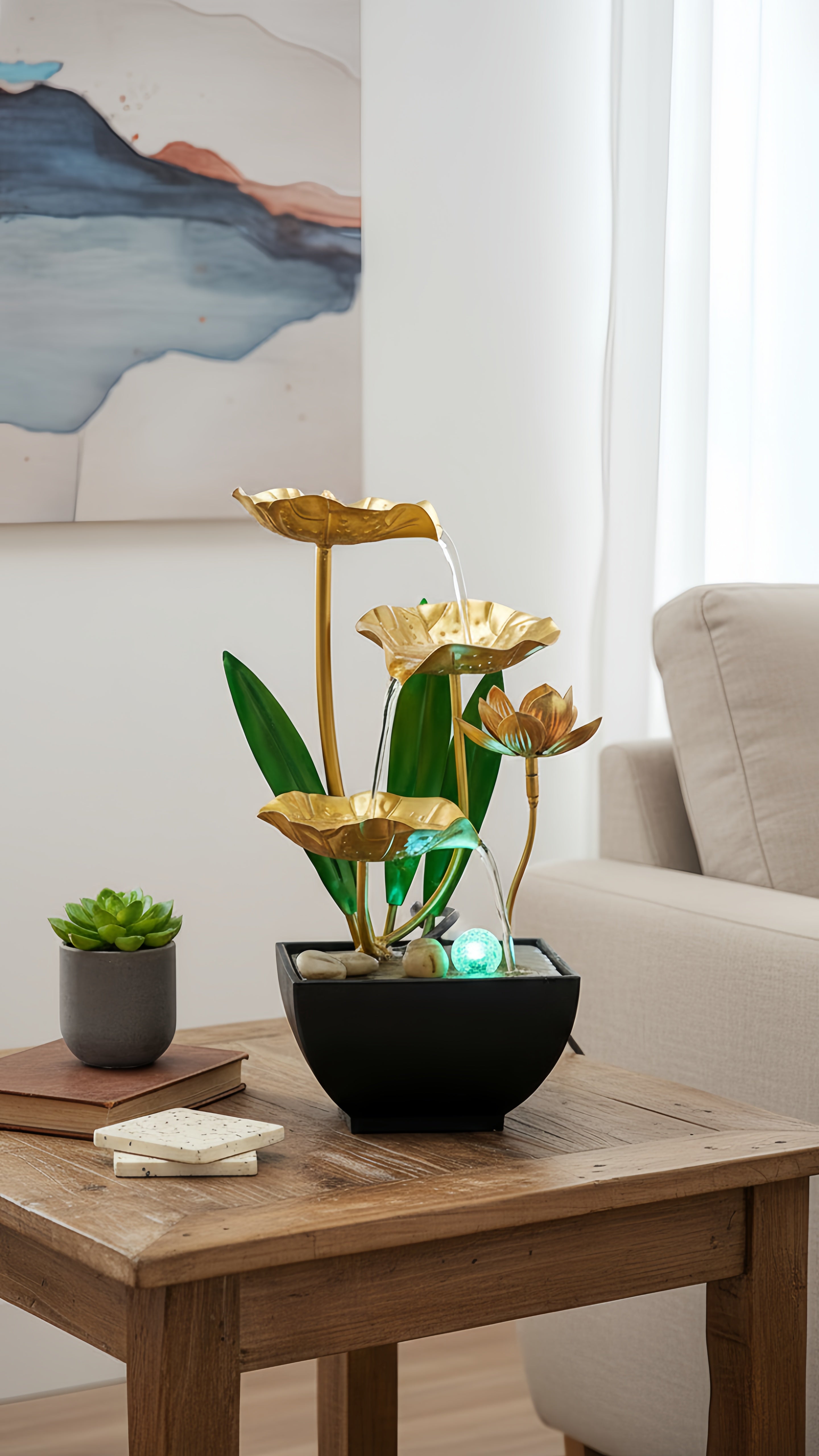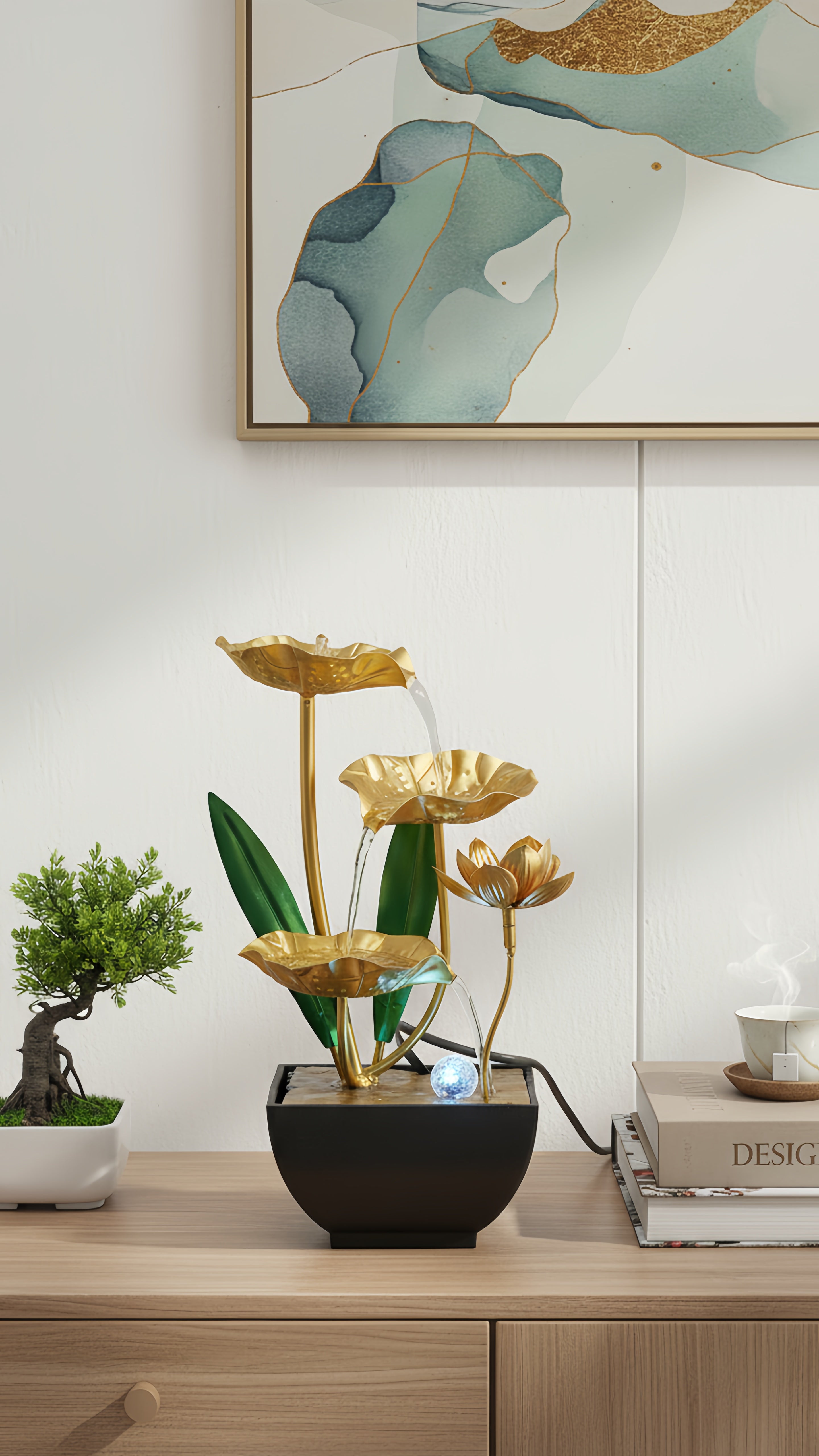 Les feuilles de lotus dorées et l'eau en cascade créent une œuvre d'art vivante. Une touche d'élégance moderne qui capte le regard.